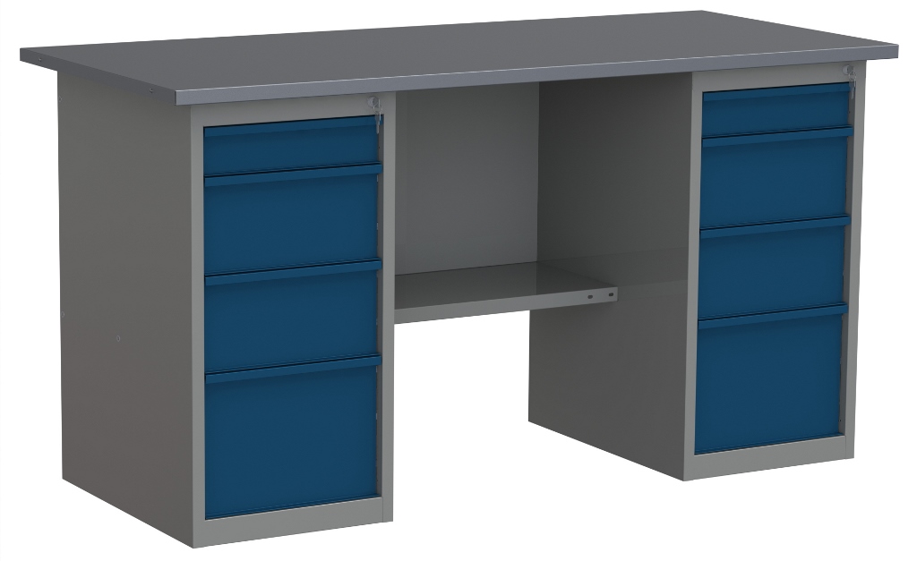 Позволяет установить большие слесарные тиски без ущерба для габаритов рабочей зоны.  Лотки на тумбах имеют усиленные шариковые направляющие полного выдвижения, выдерживающие нагрузку до 40 кг. Все тумбы оборудованы центральным замком, запирающим все лотки. Столешница из МДФ выдерживает статическую нагрузку до 600кг.
